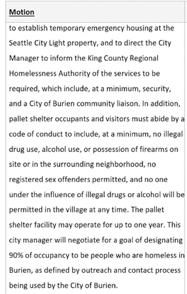 “Motion to establish temporary emergency housing at the Seattle City Light property, and to direct the City Manager to inform the King County Regional Homelessness Authority of the services to be required, which include, at a minimum, security, and a City of Burien community liaison. In addition, pallet shelter occupants and visitors must abide by a code of conduct to include, at a minimum, no illegal drug use, alcohol use, or possession of firearms on site or in the surrounding neighborhood, no registered sex offenders permitted, and no one under the influence of illegal drugs or alcohol will be permitted in the village at any time. The pallet shelter facility may operate for up to one year. This city manager will negotiate for a goal of designating 90% of occupancy to be people who are homeless in Burien, as defined by outreach and contact process being used by the City of Burien.”