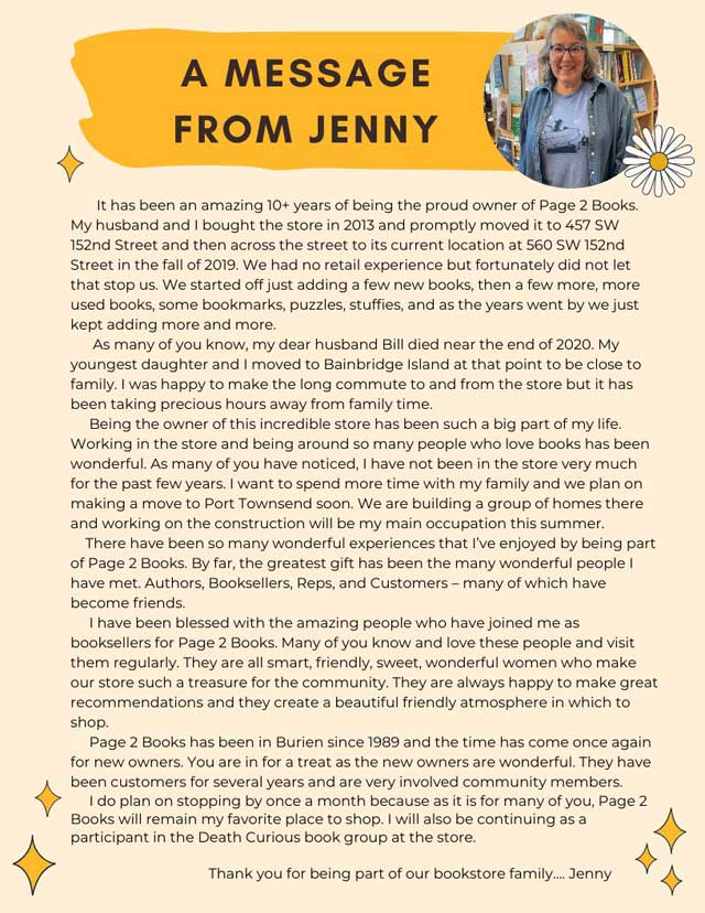 Page 2 Books, a beloved bookstore in Burien since 1989, announced this week that it is changing hands after more than a decade under the ownership of Jenny Cole.