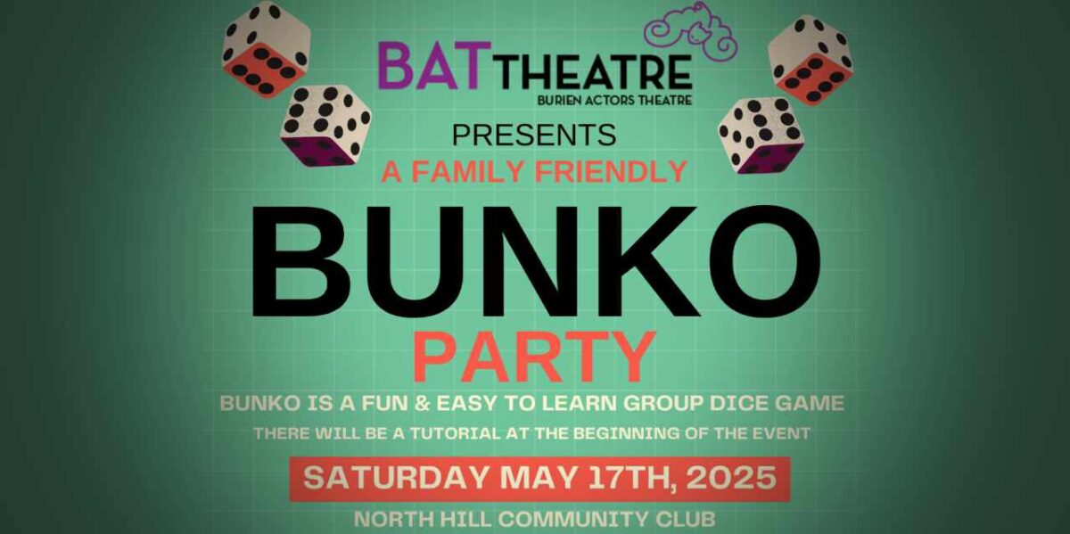 Burien Actors Theatre (BAT Theatre) will host a family-friendly Bunko Party fundraiser from 5–9 p.m. this Saturday night, May 17, 2025, at the North Hill Community Club in Des Moines.