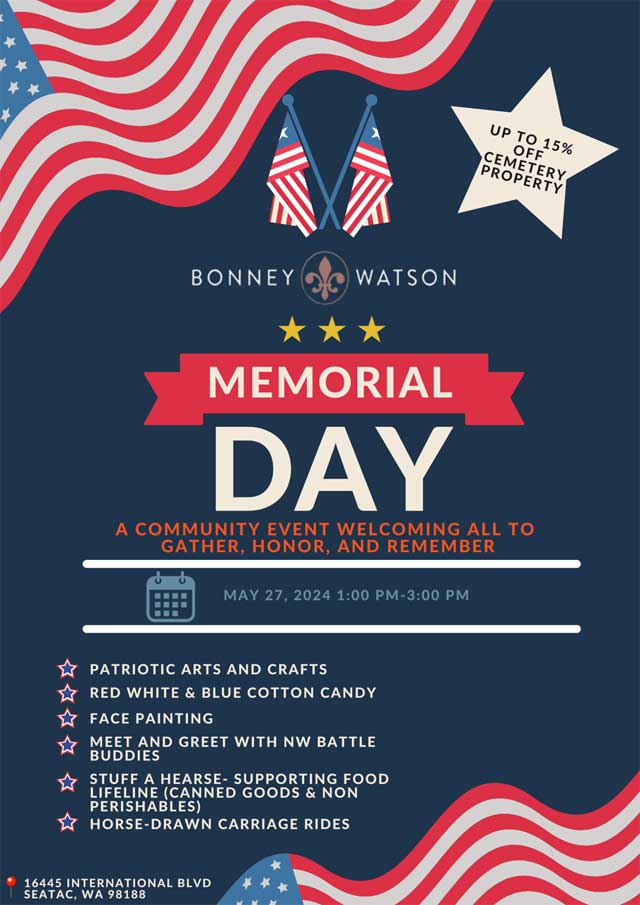 A host of activities are planned for a meaningful Memorial Day at Bonney Watson Washington Memorial Park on Monday, May 27, 2024, from 1 – 3 p.m.