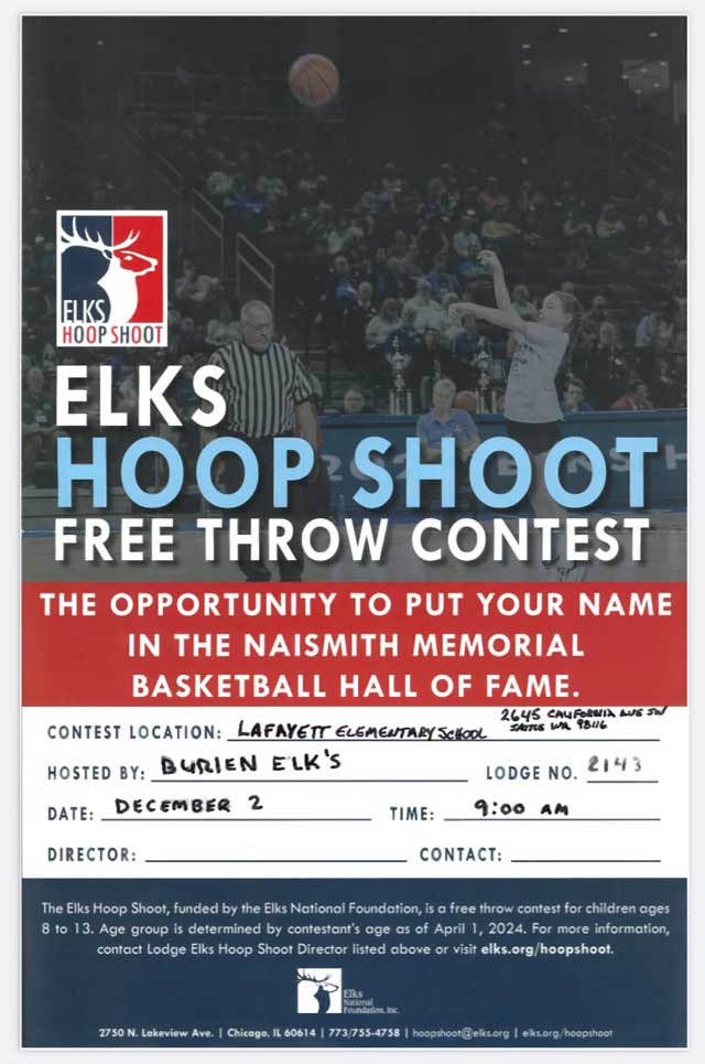 Burien Elks #2143 will be holding a Hoop Shoot this Saturday, Dec. 2, 2023, from 9 a.m. until Noon at Lafayette Elementary school in West Seattle (map below).