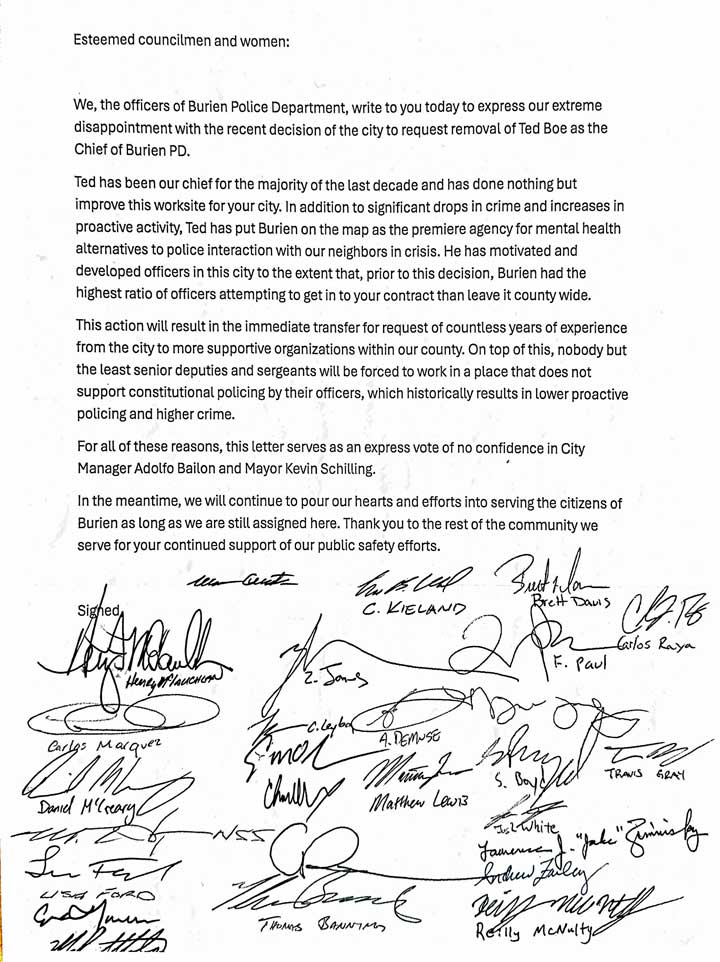 “We, the officers of Burien Police Department, write to you today to express our extreme disappointment with the recent decision of the city to request removal of Ted Boe as the Chief of Burien PD.