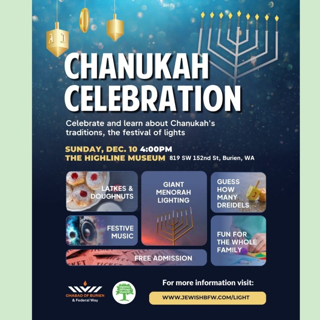Dive into the enchanting spirit of Chanukah with the Chabad of Burien & Federal Way for a spectacular celebration at the Highline Heritage Museum on Sunday, Dec 10, 2023, at 4 p.m.
