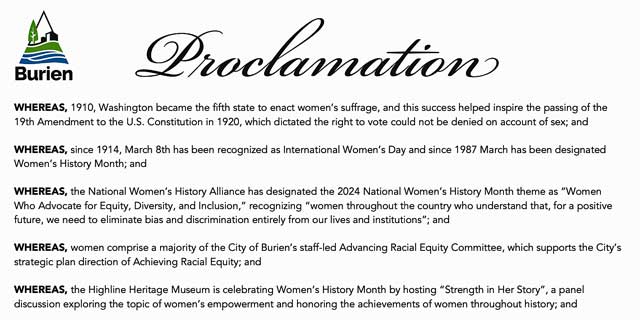 The Highline Heritage Museum is hosting a panel discussion on Saturday March 9, exploring women’s empowerment and women in history. According to the proclamation, women comprise the majority of Burien’s population, and make countless contributions to the community.