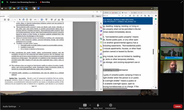 Speakers asked Council to be patient and wait for DESC to open its doors before imposing further restrictions on the homeless. They said the map being used in the proposal, which outlines areas near schools, parks, libraries and critical areas where homeless will not be able to camp, is the equivalent of red-lining for 2024. The ordinance was called inhumane and draconian. They asked for shelters first, before instituting more camping restrictions. One homeowner wanted to make sure the council knew that not all homeowners want bans on camping. Rather, they want compassionate solutions. It was said that the Burien City Council is harming Burien’s reputation, and that this proposal is targeting the homeless.