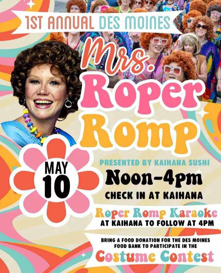 Dust off your kaftans and get ready to channel some groovy ‘70s energy — the inaugural ‘Mrs. Roper Romp’ is coming to downtown Des Moines this coming Saturday, May 10, 2025, from Noon to 4 p.m.