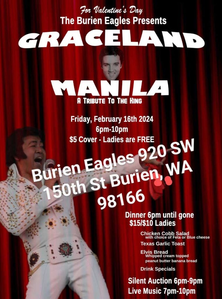 For Valentine’s Day, the Burien Eagles presents a tribute to the King with ‘Graceland Manila’ on Friday, Feb. 16, 2024, from 6 – 10 p.m….and its Ladies Night!