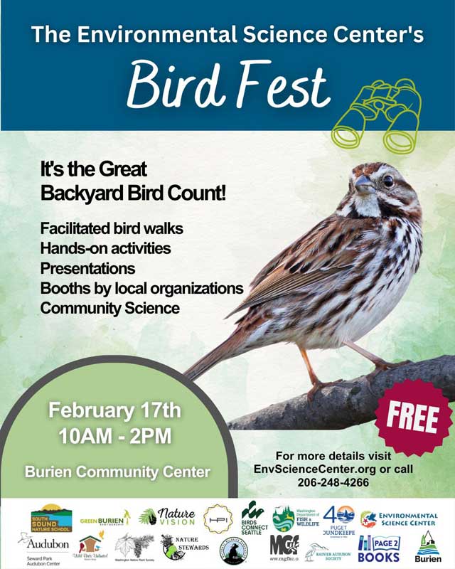 All are invited to join the Environmental Science Center and community partners at ‘Bird Fest’ on Saturday, Feb. 17, 2024 at the Burien Community Center to celebrate the Great Backyard Bird Count.