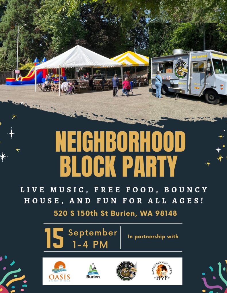 A neighborhood block party, offering live music, free food, and entertainment for all ages, is scheduled to take place in Burien’s Sunnydale neighborhood on Sunday, Sept. 15, 2024, from 1 – 4 p.m.