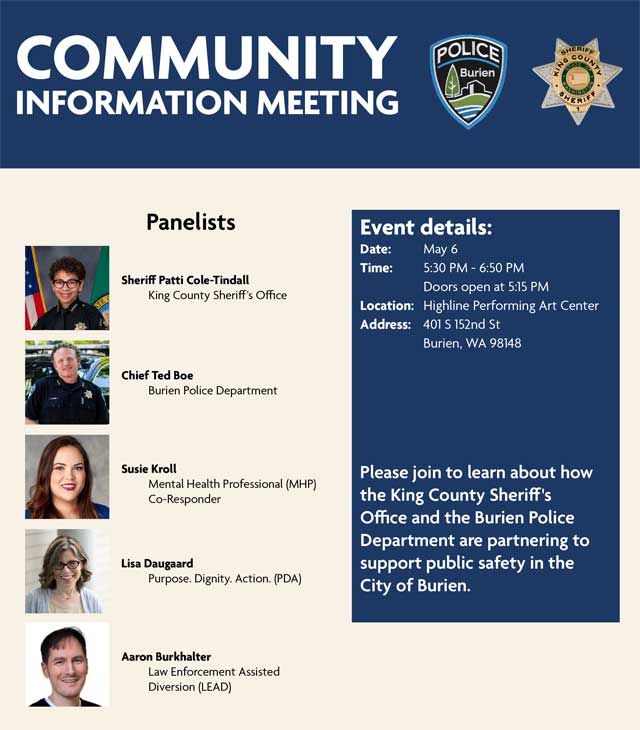 “All are invited to learn about how the King County Sheriff’s Office and the Burien Police Department are partnering to support public safety in the City of Burien.”