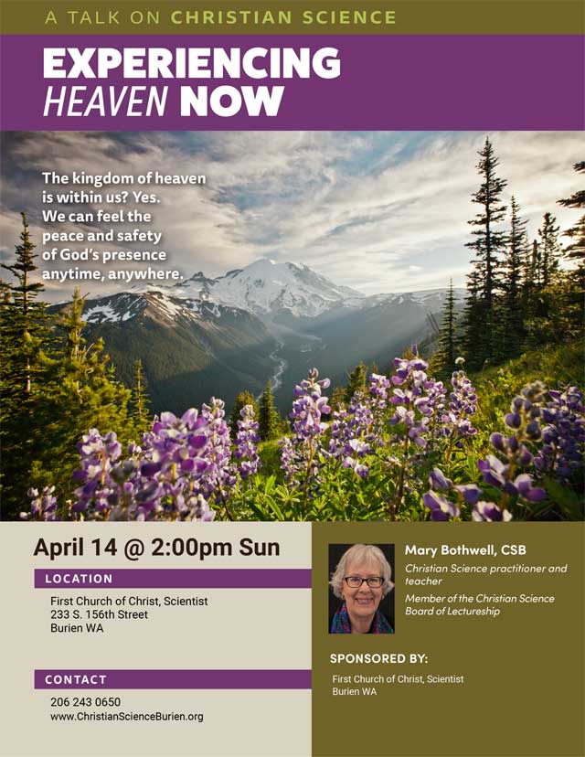WHAT: “Experiencing heaven now,” a free talk by practitioner of Christian Science healing and international speaker, Mary Bothwell. The talk focuses on universal healing precepts found in the Holy Bible, especially in Christ Jesus’ life and teachings, and shows how they are available for anyone to understand and experience through the lens of Christian Science. The talk is free, open to the community, and hosted by First Church of Christ, Scientist, Burien, Washington.