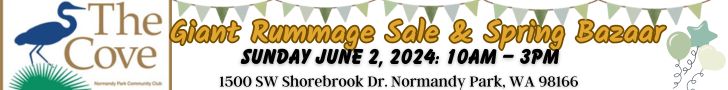 A GIANT Rummage Sale & Spring Bazaar will be held at the Normandy Park Community Center (“The Cove”; map below) on Sunday, June 2, 2024, from 10 a.m. to 3 p.m.