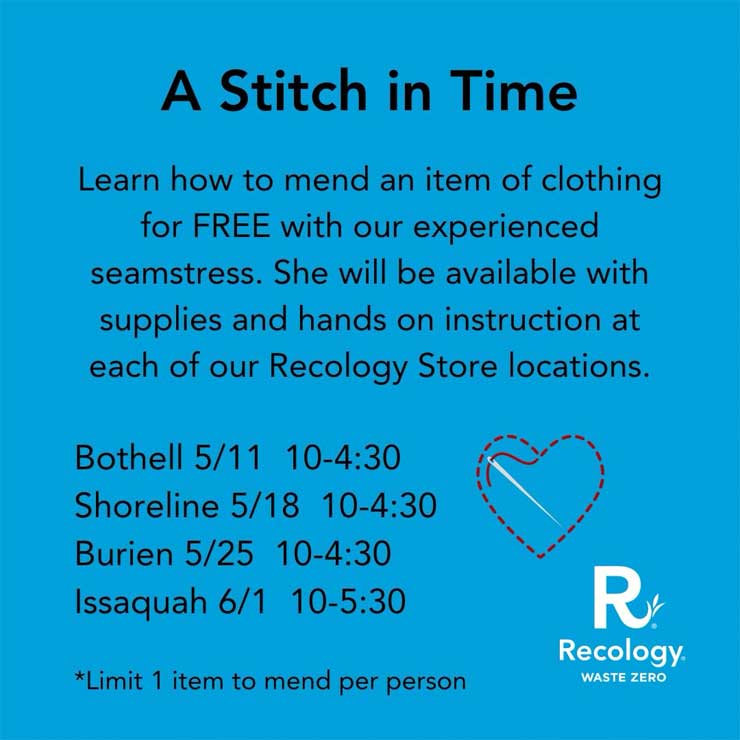 “Learn how to mend an item of clothing for FREE with our experienced seamstress. She will be available with supplies and hands on instruction at each of our Recology Store locations.”