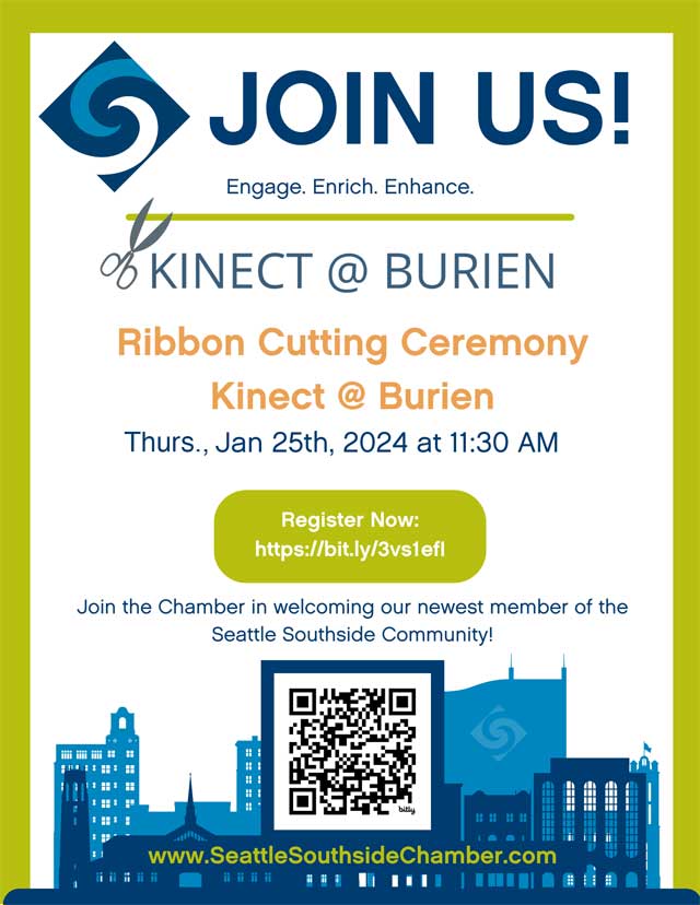 In partnership with Kinect @ Burien, the Seattle Southside Chamber of Commerce is excited to announce a Ribbon Cutting Celebration for their grand opening on Thursday, Jan. 25, 2024, from 11:30 a.m. to 12:30 p.m. in Burien.