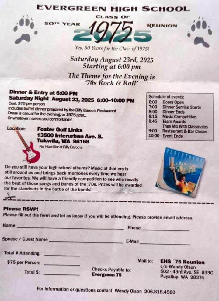 Members of the Evergreen High School Class of 1975 will reunite for their 50-year class reunion on Saturday, Aug. 23, 2025, at Foster Golf Links in Tukwila.