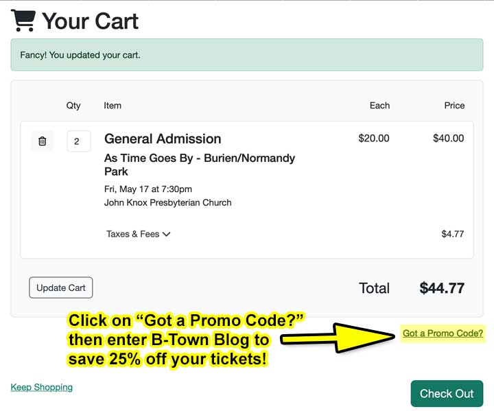 Join us for this memorable event on May 17, from 7:30 – 9 p.m. at John Knox Presbyterian Church (109 S. Normandy Rd., Burien, WA 98148; map below), our new home for rehearsals and performances. To celebrate this milestone and our exciting new venue, we’re giving you the opportunity to save 25% on your ticket purchase when you use the code “B-Town-Blog” at checkout.