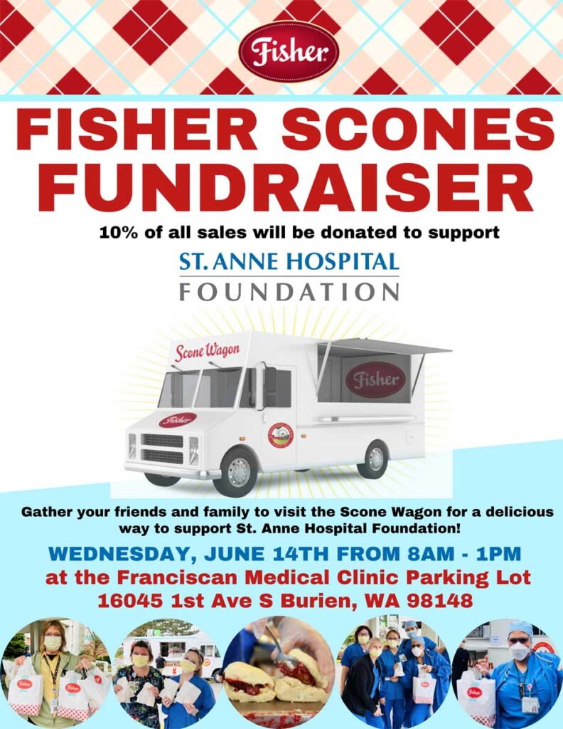 The Fisher Scones Truck is coming to Burien on Wednesday, June 14, 2023, to support St. Anne Hospital Foundation.