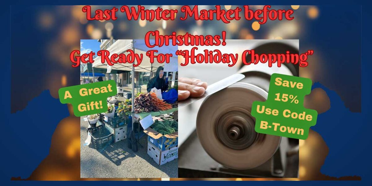 Are you still doing last-minute ‘chopping’ for the holidays? Here’s one great idea – get knives sharpened at the Burien Farmers Market this Thursday, Dec. 21, 2023 – come see Scott McClure from Sharper-Tools LLC, Where Sharpness Meets Excellence.