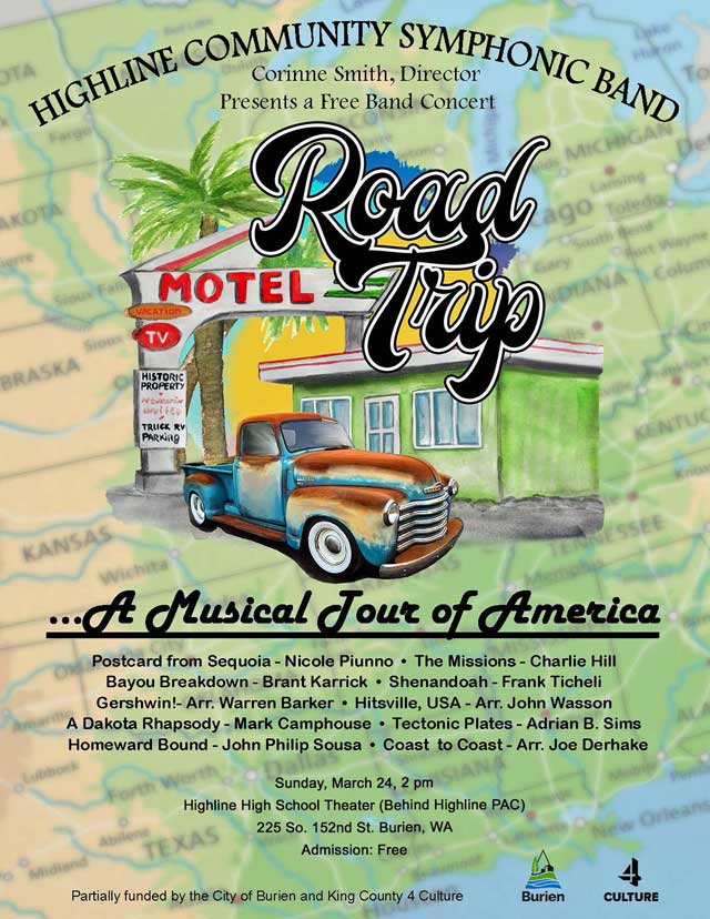 The Highline Community Symphonic Band will be performing a free concert – “Road Trip” – at the Highline High School Theater this Sunday, Mar. 24, 2024, starting at 2 p.m.