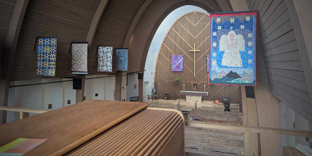 This scene was calm, in contrast, with items of ritual illuminated in natural light at the front of the nave. Over the pews, the arched ceiling was decorated with a series of handmade quilts. Despite the quilts, the nave remained chilly through the 60-minute service. I found out later that the furnace was having issues, and it should be cozier than it was during my visit.