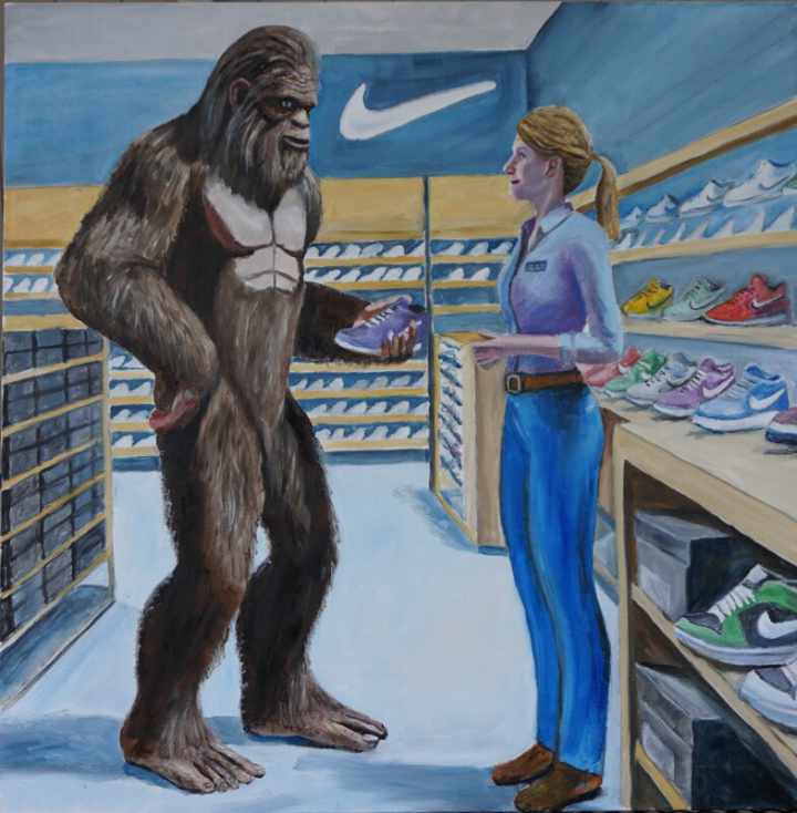 In the last two years, Morreall has concentrated on the comic possibilities of Sasquatches, creating 41 paintings in a series he calls “Sasquatch Scrapbook.” Ten of those works are currently on display at Humble Vine. When the series reaches 50 paintings, Morreall said he plans to seek a publisher.