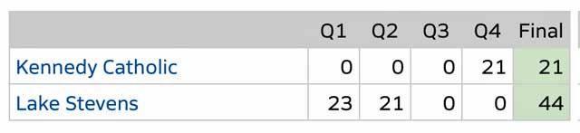 The Kennedy Catholic High Lancers lost in the second round of the WIAA 4A state varsity football tournament to Lake Stevens by a score of 44-21 on Friday night, Nov. 17, 2023.