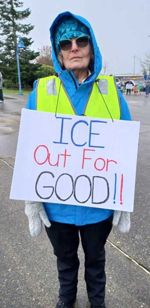 He is not totally responsible for why we are out there. He’s just given everyone permission to do and say whatever they want because that’s what he does. The vitriol he spews is no longer even shocking. He has normalized hatred and vulgarity. But that hatred has been brewing under the surface for many years, saved only by the rule of law that we were entitled to here in America. Now, if you are black, brown, LGBTQ, Jewish, disabled, a veteran – a woman – you are LESS THAN, and you can be pulled off the street, whether you are a citizen or not, without recrimination. You can even be murdered, as Renee Good was on Wednesday, which brought us out on Sunday, January 11. And we were heartened that it wasn’t just us seniors who felt compelled to join in the outrage: there were younger people at Big Catch Plaza, too. The group was more than the two dozen or so of us regulars. Oh, and they were generous, too: the Des Moines Area Food Bank received $289 in donations (thank you all!).
