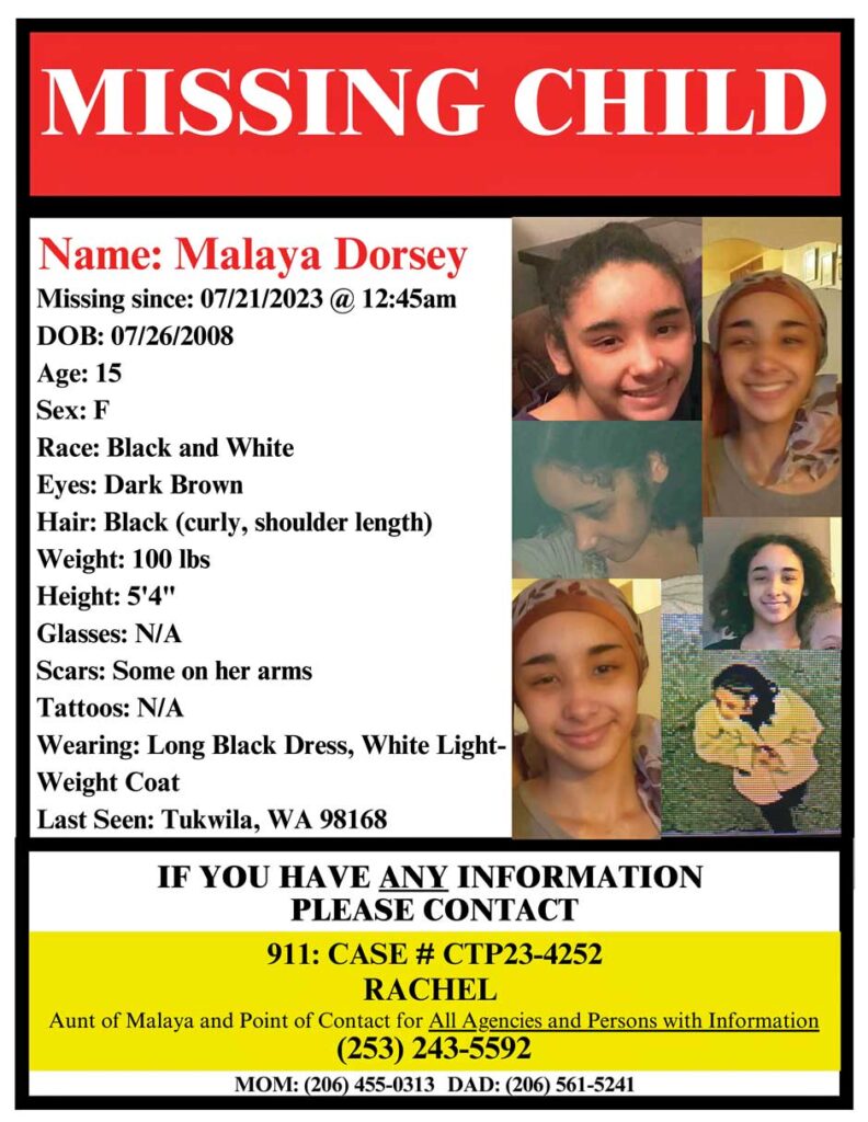The Washington State Patrol and Tukwila Police are seeking Malaya Dorsey, a missing 15-year-old girl who was last seen at 1:10 a.m. on July 21, 2023 on 43rd Ave South in Tukwila.