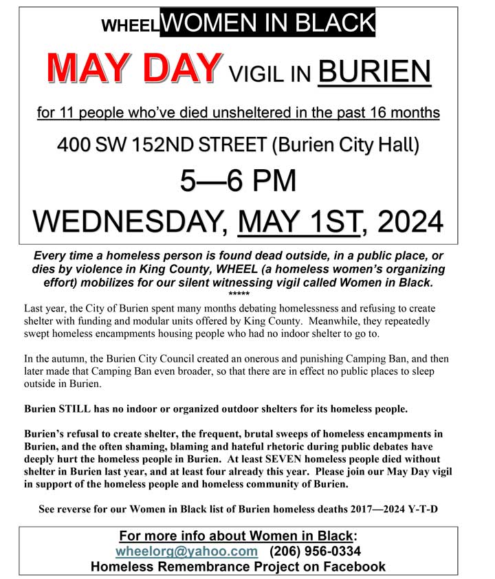 WHEEL/Women in Black will be holding a May Day Vigil for homeless people who’ve died from 5-6 p.m. tonight – Wednesday, May 1, 2024 – outside Burien City Hall.