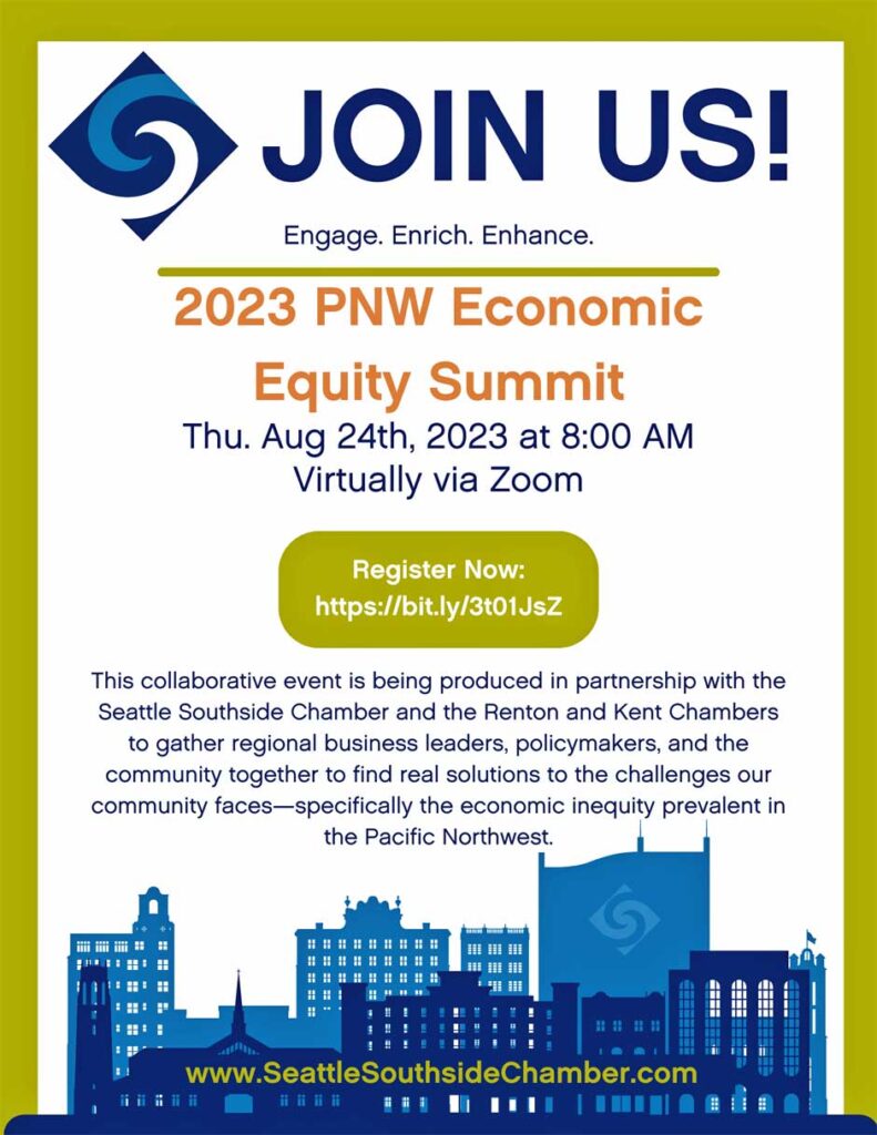 The 2023 PNW Economic Equity Summit will be held on Thursday, Aug. 24, 2023, from 8 a.m. – 11 a.m. at Highline College.