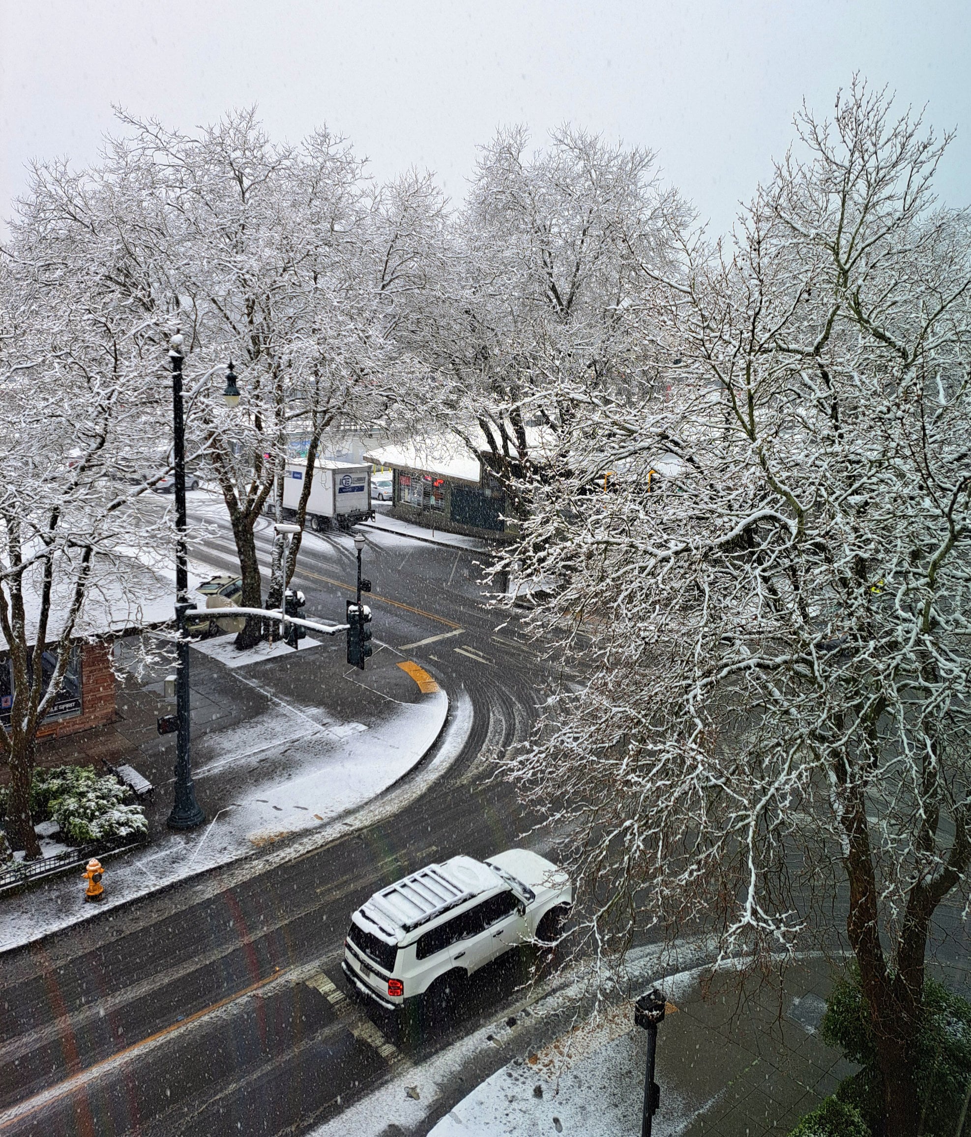Snow dusts London plane trees along SW 152nd Street and 6th Ave SW in downtown Burien in this photo by Mary Ann Newton taken Friday, Mar. 13, just a week before the official start of spring.