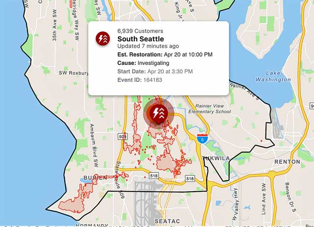 Crews are responding to outages in the West Seattle, SeaTac, and Burien areas affecting approx. 11,500 customers. The cause is under investigation and an estimated time of restoration has yet to be determined.