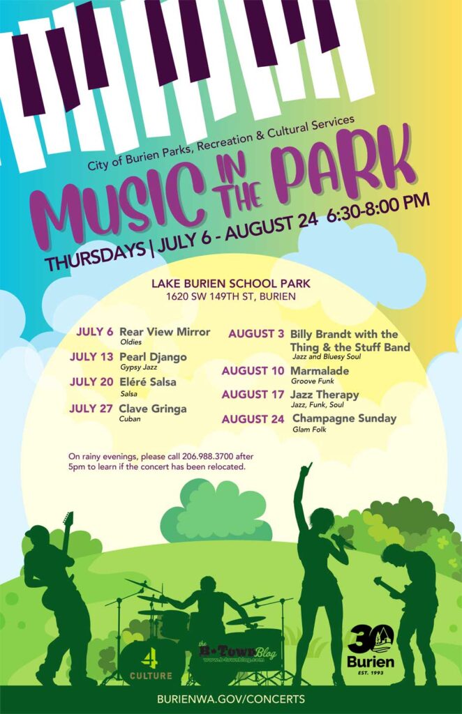 This free live music series runs from 6:30 – 8 p.m. every Thursday night through Aug. 24 at Lake Burien School Memorial Park.