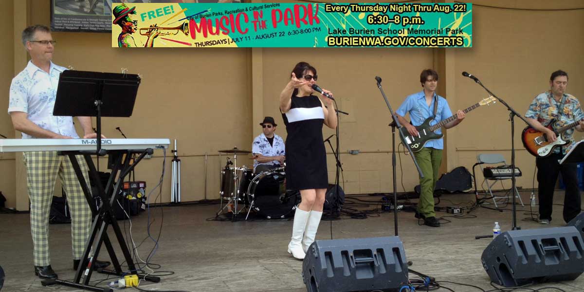 REMINDER: Burien’s free 2024 ‘Music in the Park’ series continues this Thursday night, July 18, 2024 at Lake Burien School Memorial Park, with groovy live music from The Spyrographs.