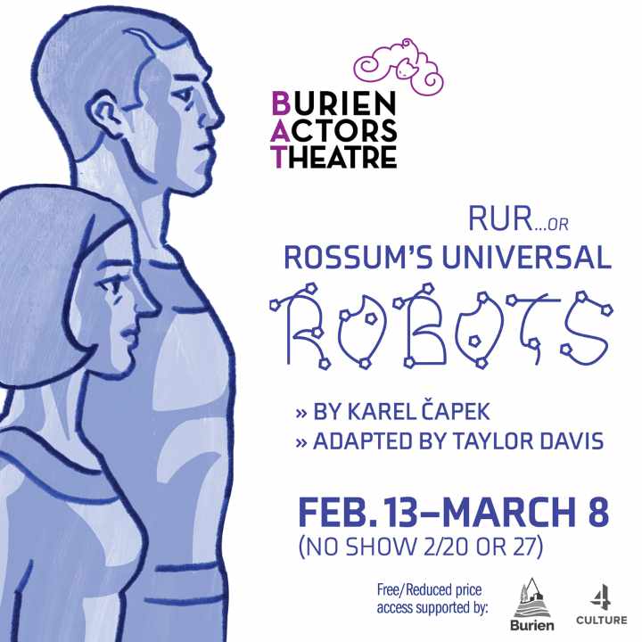 If ticket pricing is a barrier, reach out to BAT at tickets@BATtheatre.org — theater is for everyone! Free/reduced price access for R.U.R. (Rossum’s Universal Robots) is supported by 4Culture and the City of Burien.