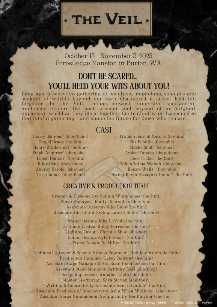 Dacha, a Seattle-based theatre company founded in 2016, specializes in playful and immersive theater, and that’s exactly what they bring to their latest show, “The Veil.”