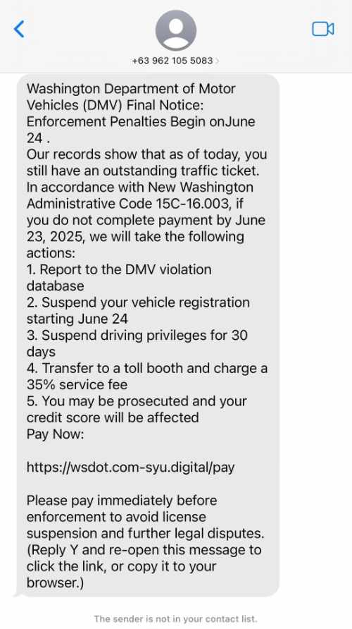 The Kent Police Department is warning residents to ignore and delete scam text messages that falsely claim to be from the Washington (or Seattle, etc.) Department of Motor Vehicles (DMV).