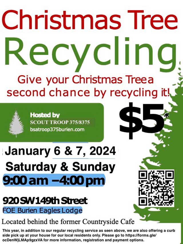 St. Francis Scout Troop 375/8375 will be hosting their annual Christmas Tree recycle event on Saturday and Sunday, Jan. 6-7, 2024, from 9 a.m. – 4 p.m. at their usual location at the Burien Eagles (map below).