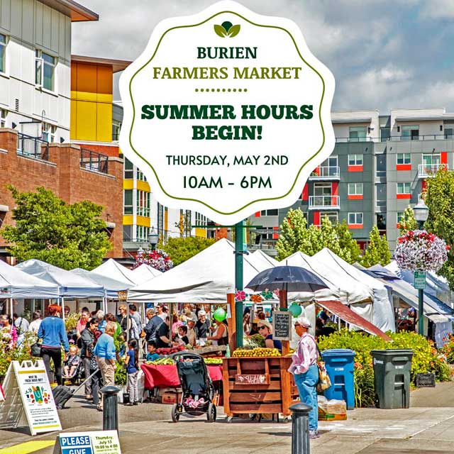 Summer hours – from 10 a.m. – 6 p.m. – start this Thursday, May 2, 2024 at the Burien Farmers Market.