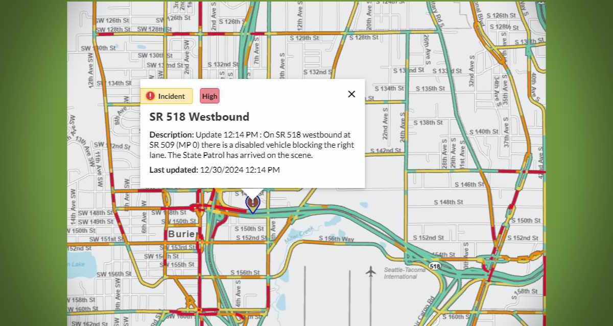 A disabled vehicle on westbound SR 518 near SR 509 caused traffic disruptions in Burien Monday afternoon, Dec. 30, 2024, blocking the two right lanes. According to the Washington State […]