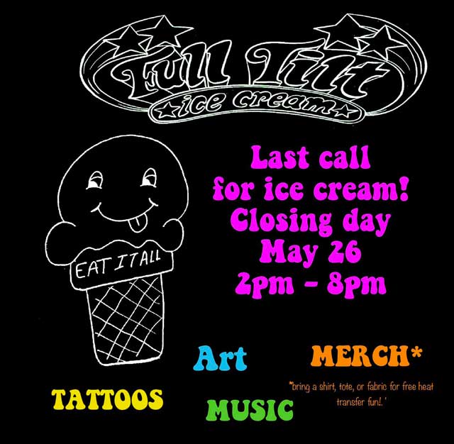 This will be the last call for Full Tilt’s amazing ice cream and eclectic atmosphere, from 2 – 8 p.m.