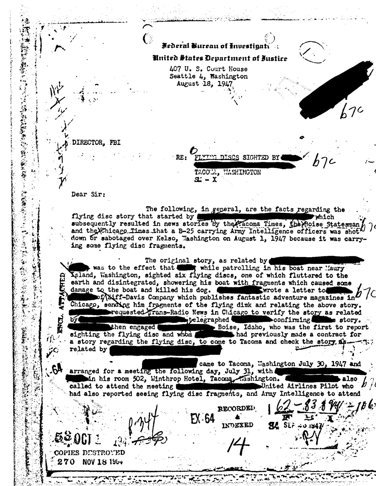Today (Tuesday, Aug. 19, 2014), is the 67th anniversary of FBI Special Agent Jack B. Wilcox’s 14-page memorandum to J. Edgar Hoover on the subject of “FLYING DISCS SIGHTED BY FRED CRISMAN and HAROLD A. DAHL, TACOMA, WASHINGTON,” as well as the release of film distributor IndieFlix’s “First original series: The Maury Island Incident“!