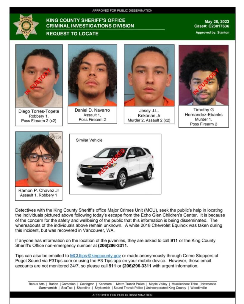 Detectives with the King County Sheriff’s office Major Crimes Unit (MCU), seek the public’s help in locating the individuals pictured below following Saturday’s escape from the Echo Glen Children’s Center.