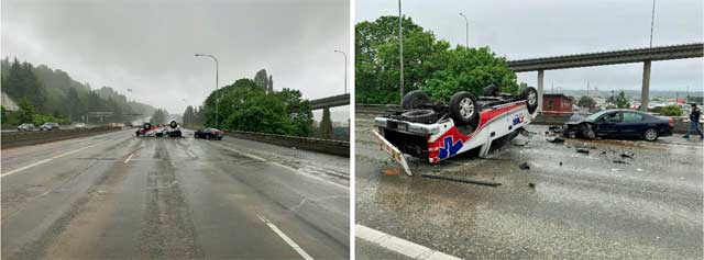 - The collision occurred around 4 a.m. on June 2, 2024, when a green 1996 Toyota Corolla, traveling down the ramp from the West Seattle Bridge to southbound I-5, lost control and struck the barrier, ending up in lane 1.